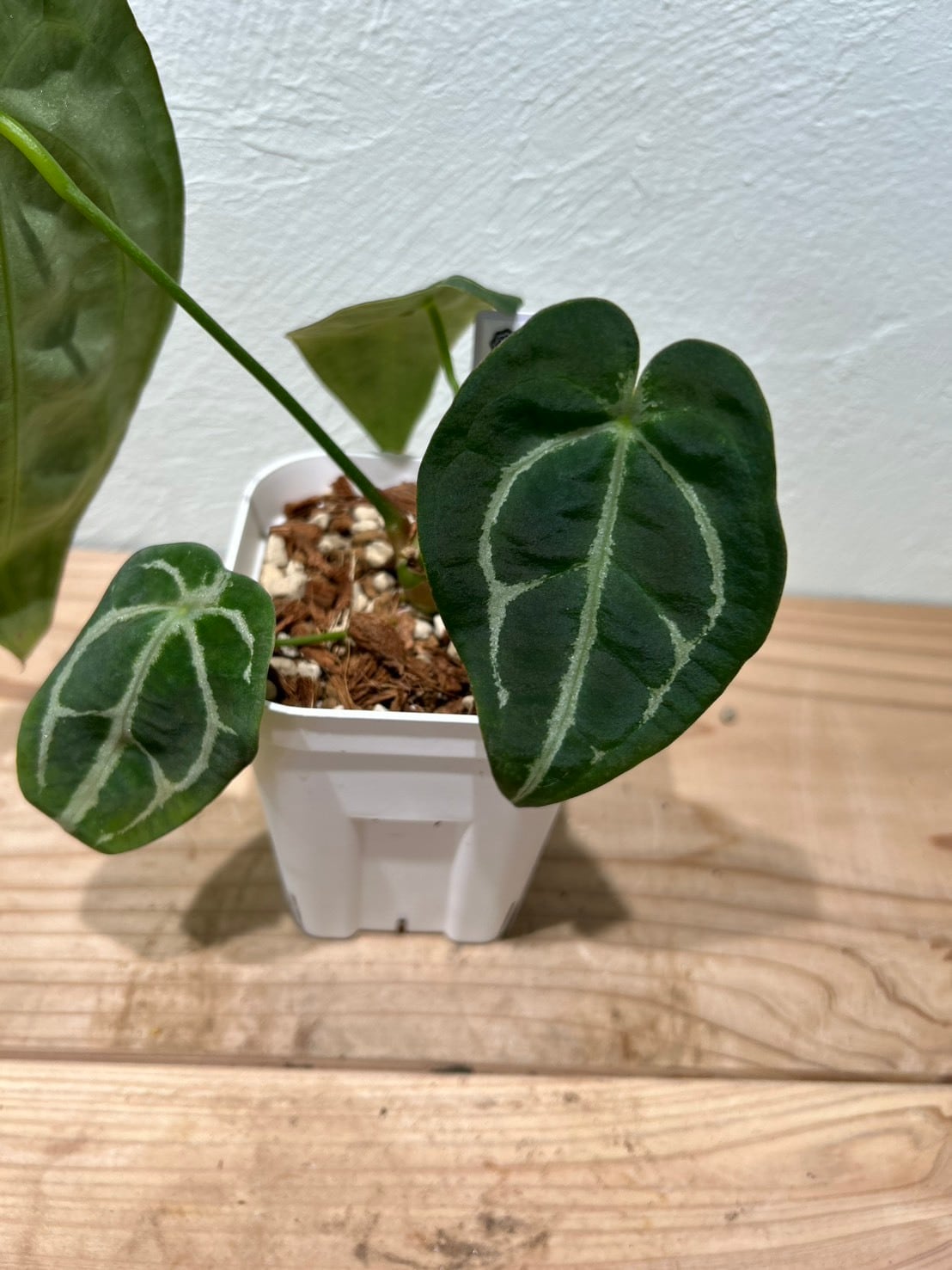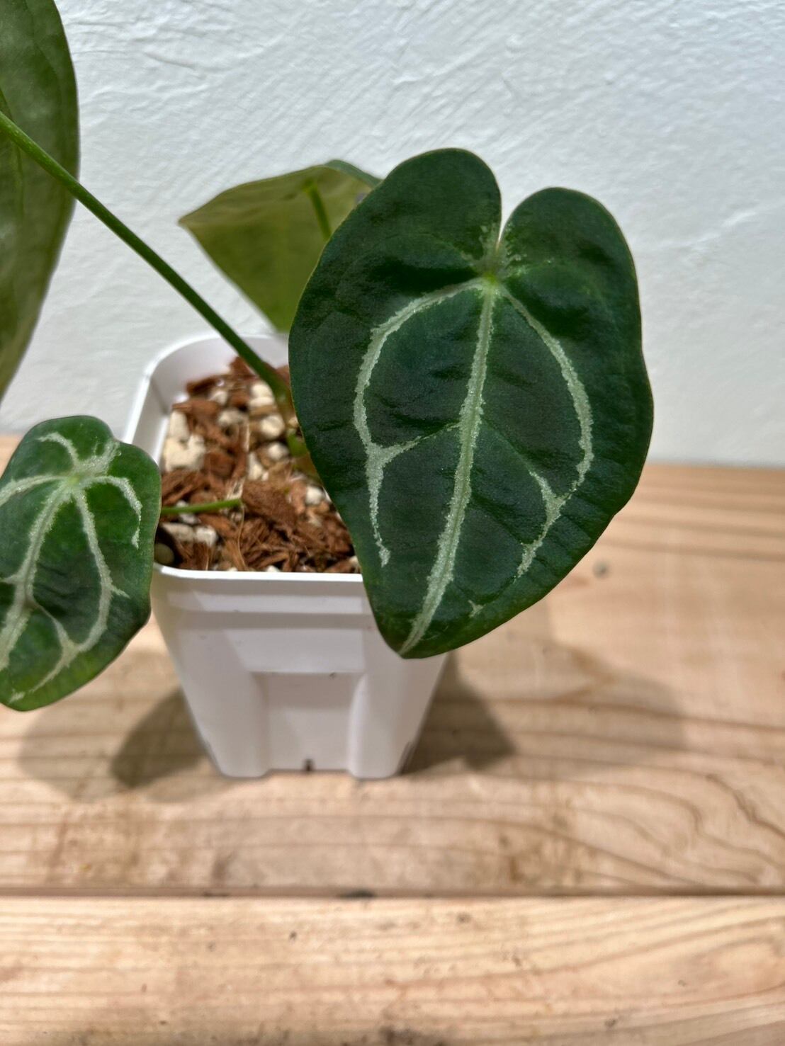特徴的な葉脈と質感: 濃い緑の葉に、白~淡いグリーンの葉脈が美しく分岐して広がり、ベルベット調の葉は高級感があります。