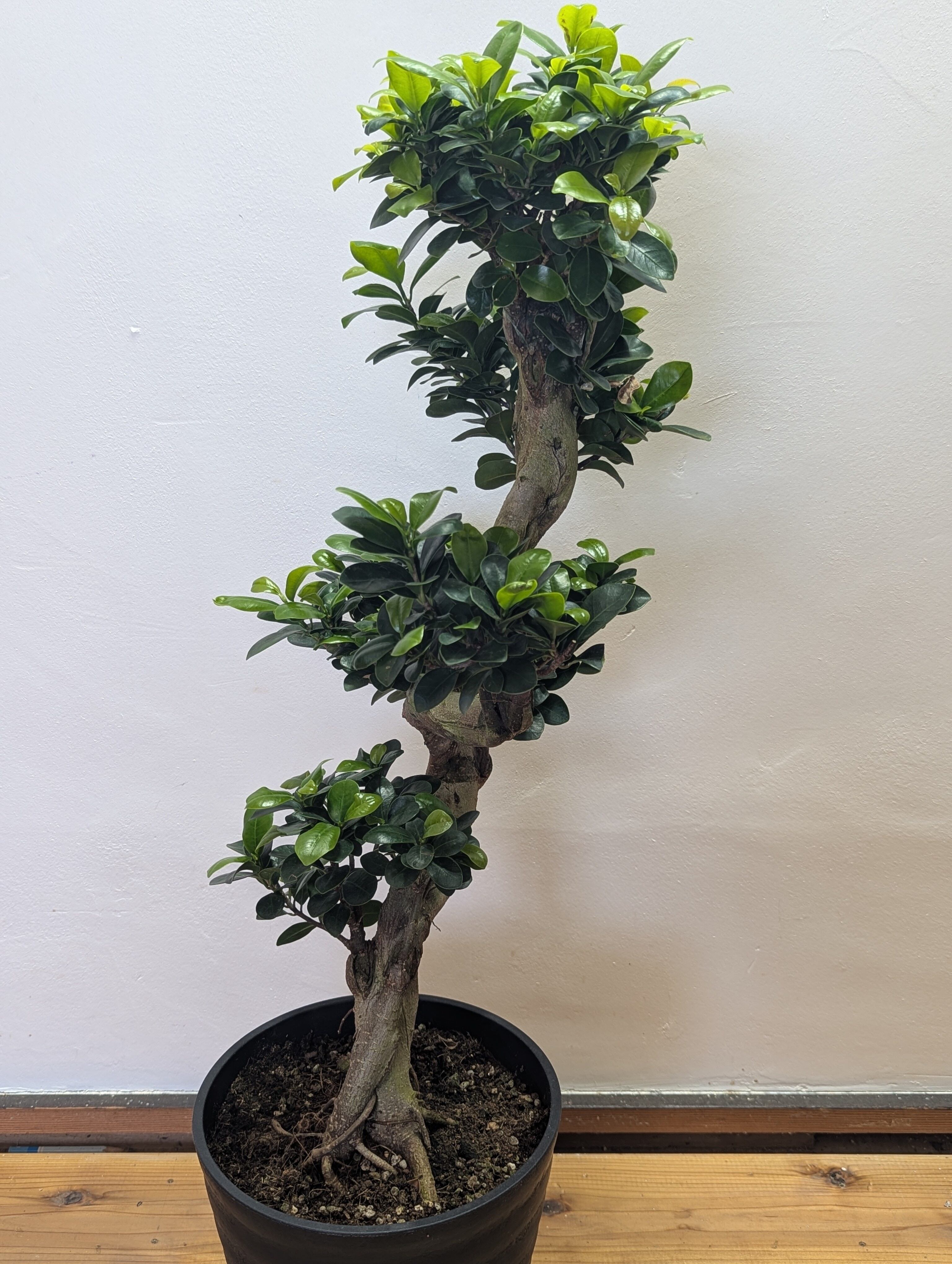 幹が美しく曲がった存在感のある樹形で、インテリアとしても映える一点物です。丸く艶のある葉がバランスよく茂り、ナチュラルで落ち着いた空間を演出してくれます。
