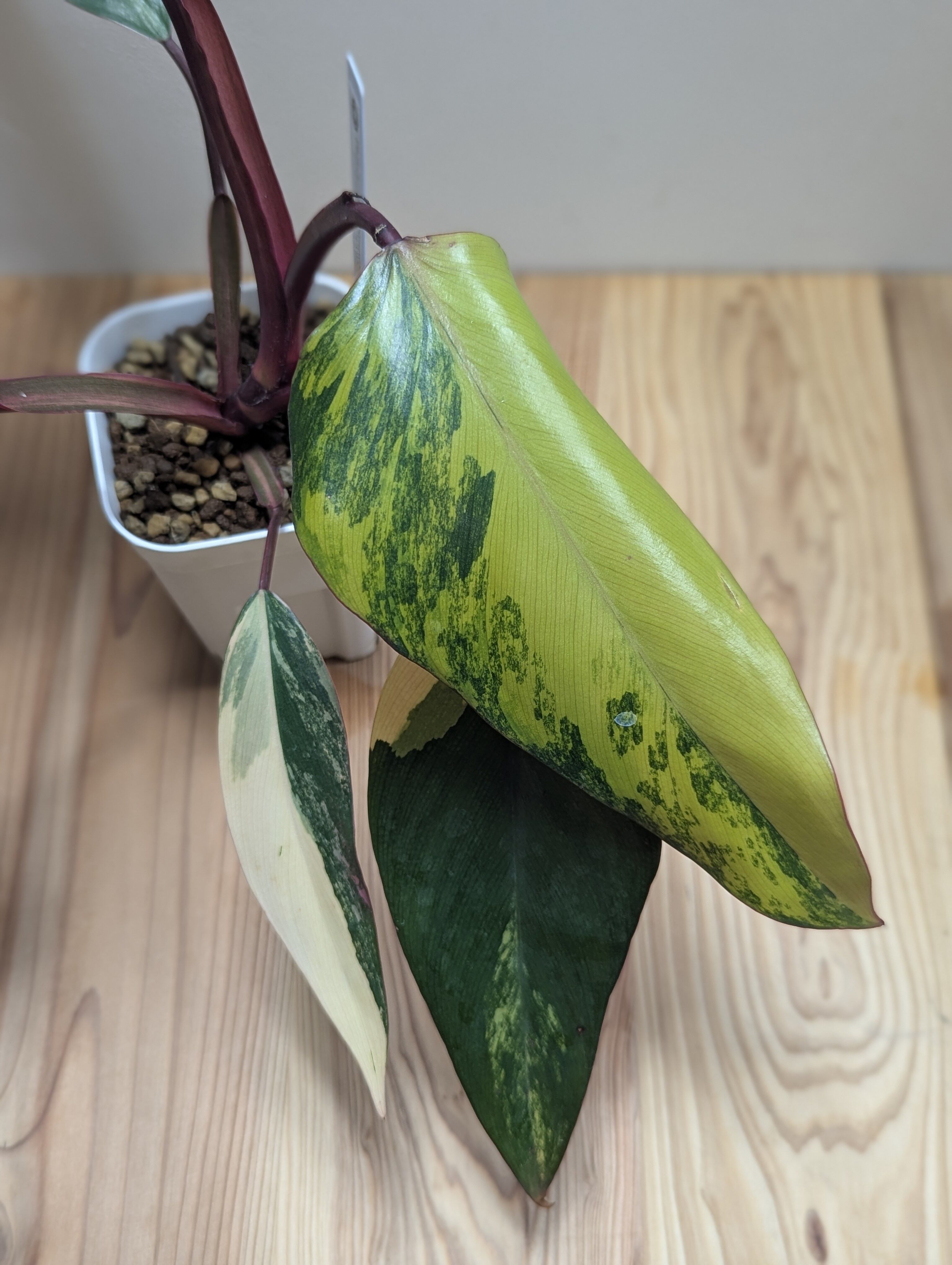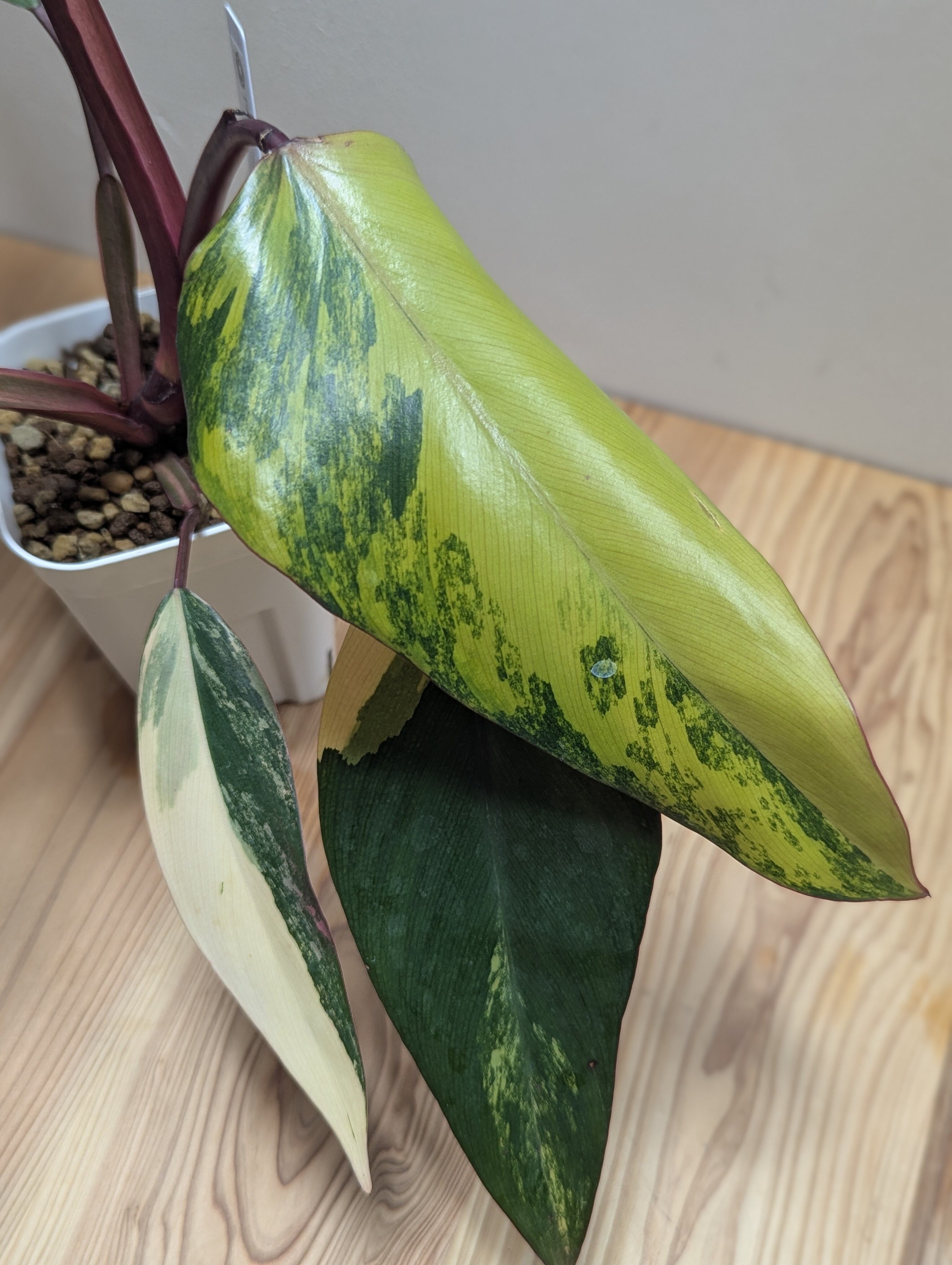 やわらかなクリーム色、ライムグリーン、深いグリーンが重なり合う 個性的な葉模様がとても美しく、 1株ごとに異なる表情を楽しめる人気品種です。