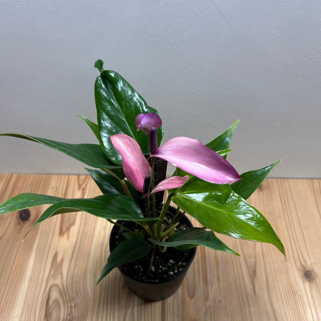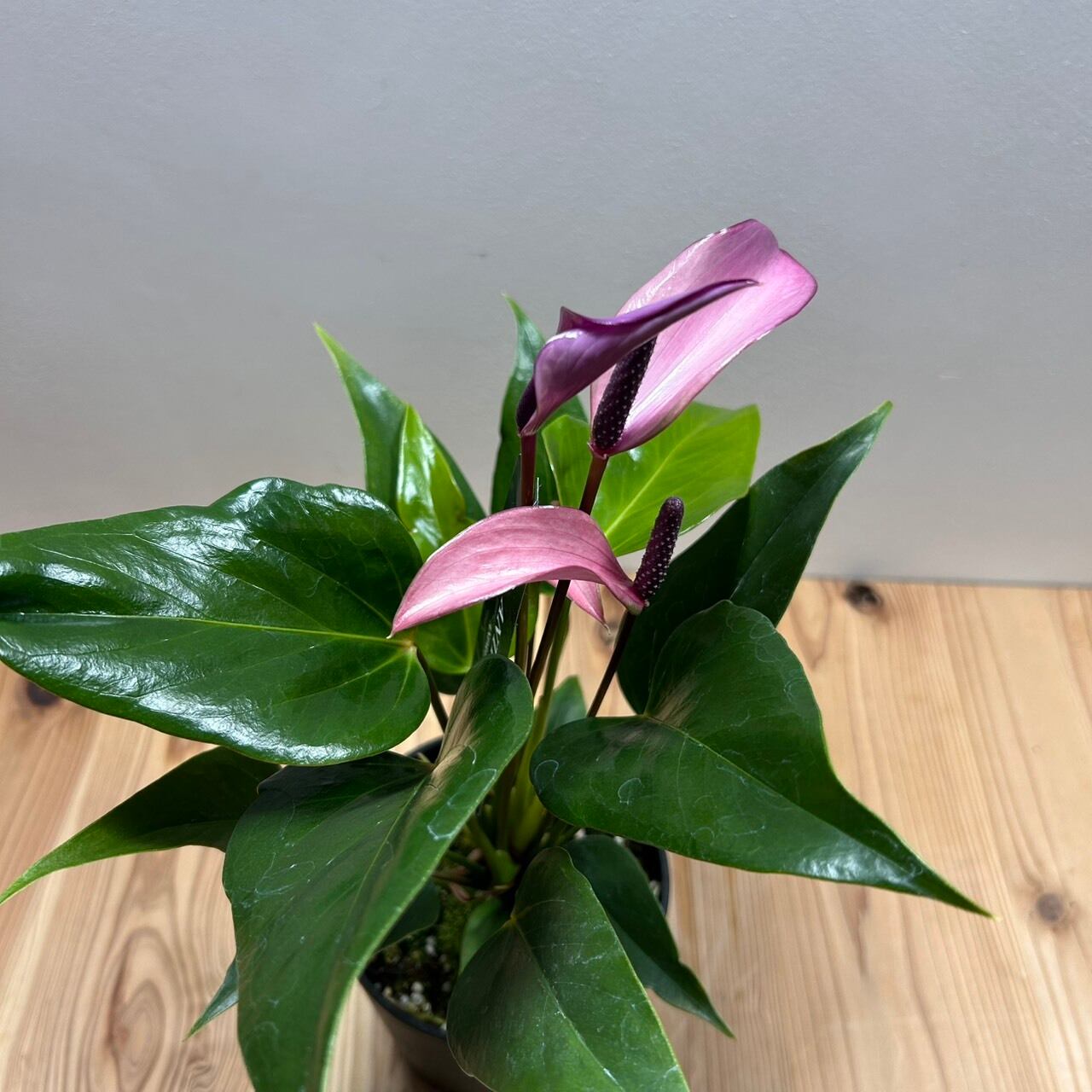 艶のある美しいグリーンの葉と、やさしいピンク〜パープル系の花色が目を惹くアンスリウム・ジゾー。